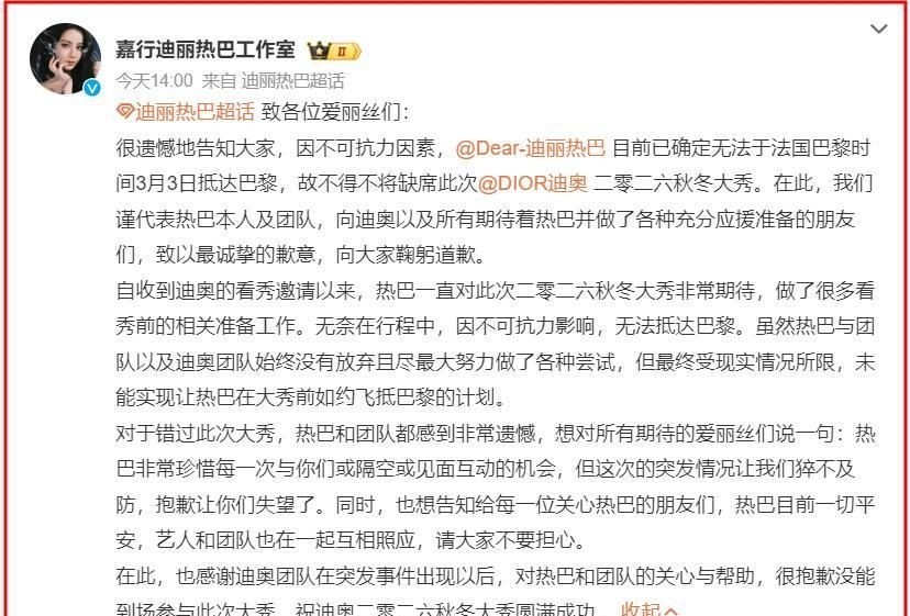 并就缺席向迪奥品牌方、合作媒体及全体支持者致以深切歉意与诚挚慰问。