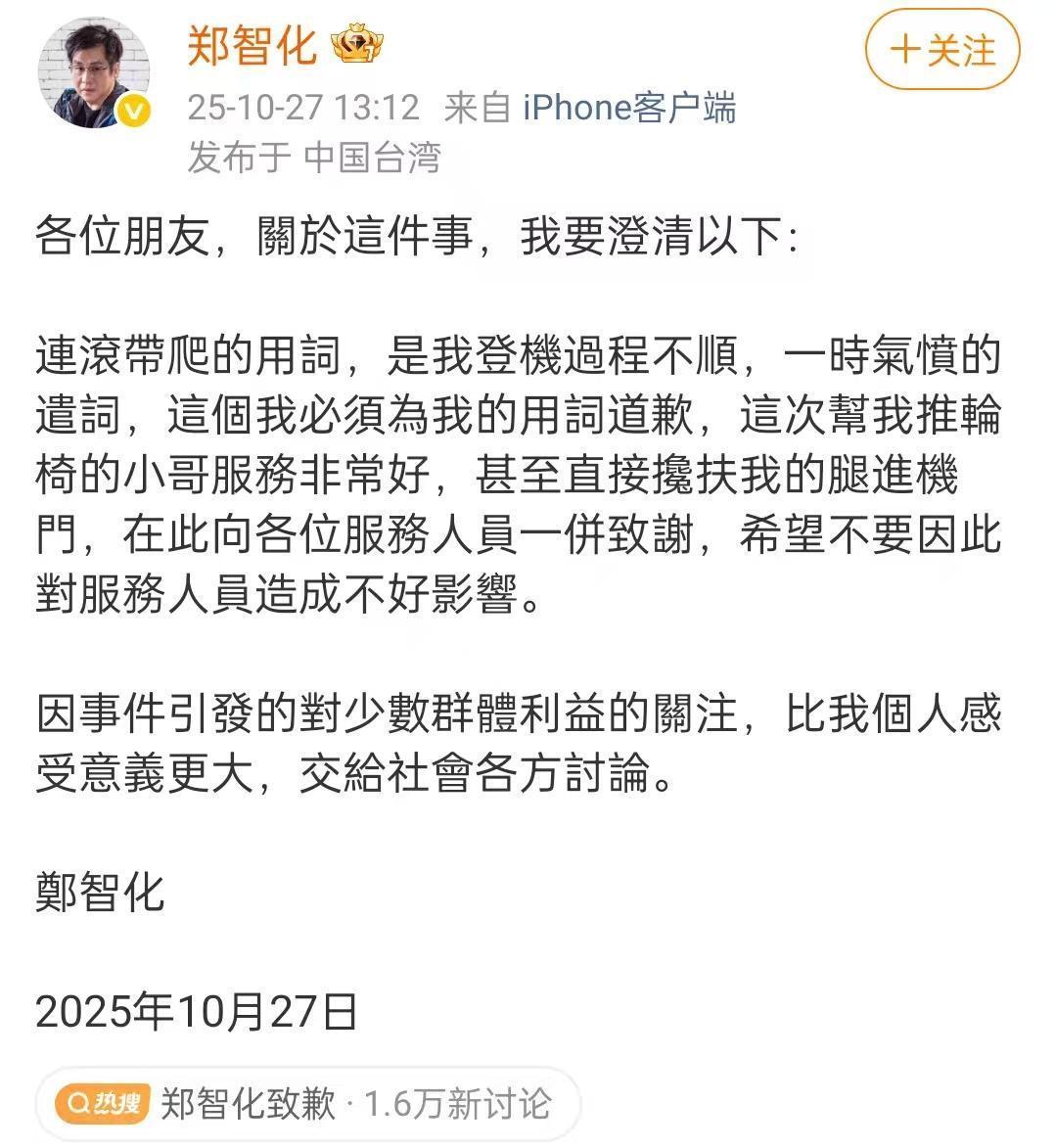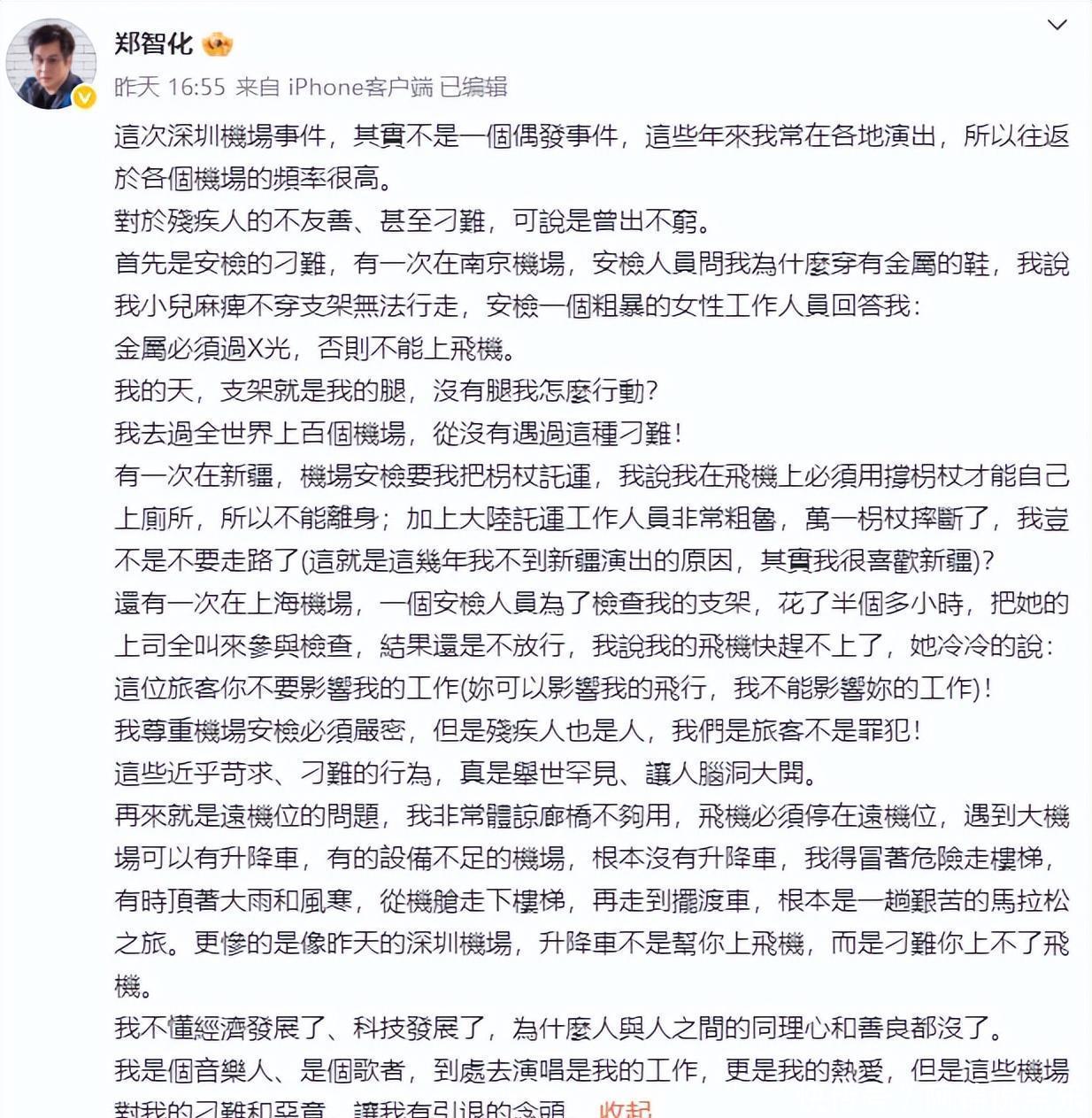 郑智化道歉后续,陈震曝其待遇“超规格”,胡锡进的点评一针见血 郑智化估计自己都懵了,一条吐槽博文,闹得全网沸沸扬扬,才两天就从 “仗义执言” 变成了公开道歉。 一开始他说深圳机场对残疾人 “没人性”,说举升机和机舱有落差,全是升降车司机的锅。机场很快道歉整改,他说接受但还揪着司机不放,后来又说其他机场服务也差,甚至想隐退。结果监控一放,网友看完全反转了,他只好道歉,说 “连滚带爬” 是用词不当,还夸机场工作人员服务好。